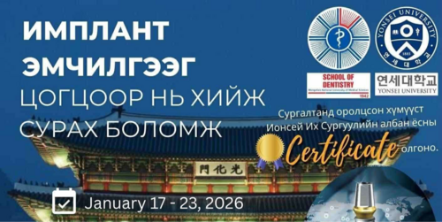АШУҮИС-. НАСС болон Ионсей Их Сургуулийн хамтарсан "Имплант эмчилгээг цогцоор нь хийж сурах боломж" сургалт болно